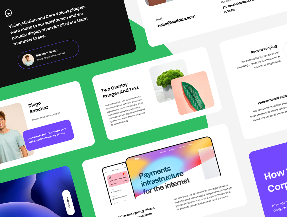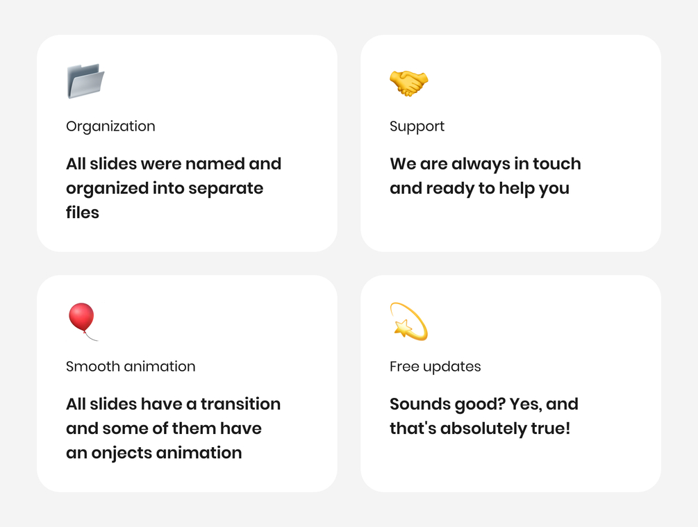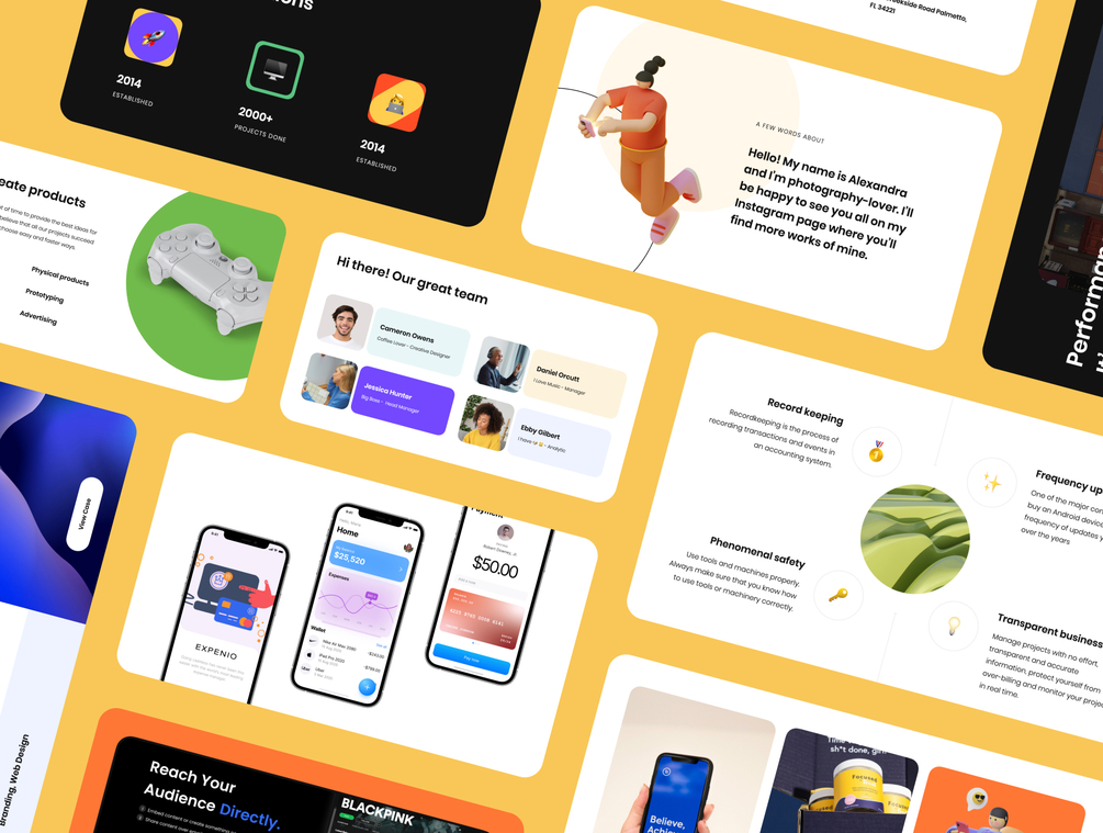 360 unique slides created specifically for PowerPoint, Keynote, Google Slides and Figma divided into 11 categories: